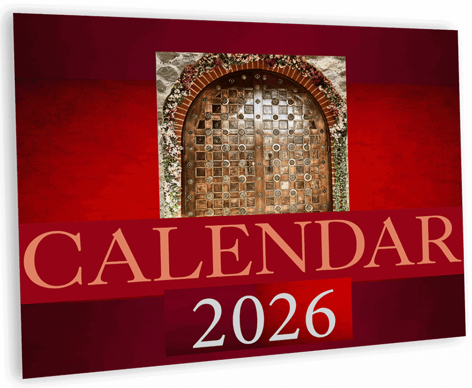 Our 2026 wall calendar adorned with photos from our newly built church dedicated to Saint Sophrony the Athonite alongside extracts from the book The House of our Father.