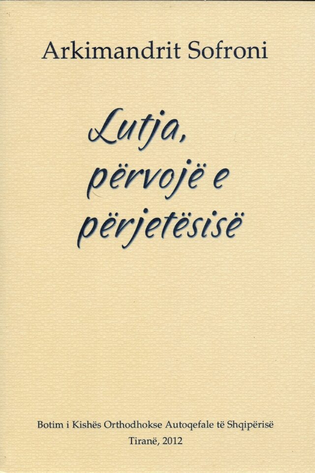 Cili është kuptimi i jetës? Të bëhesh “person”, përgjigjet arkimandrit Sofroni (1896-1993) te Lutja, përvojë e përjetësisë. Që të bëhesh “person”, do të thotë të bashkohesh dhe t’i ngjasosh Krishtit, të bëhesh mbajtës edhe i plotësisë hyjnore, edhe i mbarë njerëzimit, me vuajtjet dhe gëzimet e tij. Por si të hysh pra, në dashurinë e Perëndisë, në Dritën e Tij që na u zbulua në malin Thavor? Përmes përulësisë, shndërrimit të pandërprerë të të gjithë qenies, trupit, shpirtit dhe mendjes. Si “arti i arteve”, lutja është çelësi i kësaj metamorfoze të brendshme. Si dhunti e jetës së bollshme të Shpirtit të Shenjtë, ajo e restauron ikonën e Perëndisë te ne. Lutja ballë për ballë Qenies së përjetshme, është burimi i atësisë shpirtërore dhe i teologjisë së vërtetë, është njohje që të kungon me Perëndinë. Por, “si krijim që gufon gjithmonë”, lutja është edhe udhë e kryqit, betejë pa fund në zemër mes Dritës hyjnore dhe errësirave të njeriut të vjetër, fuqia çliruese e Krishtit nga pushteti skllavërues i pasioneve. Për këtë “udhë të ngushtë” në kufijtë e të dukshmes dhe të padukshmes, mes rënieve dhe ngritjeve, dëshpërimit dhe gëzimit paskal, na flet atë Sofroni. Jo nga jashtë, duke u nisur nga dija livreske, por nga brenda, nga përvoja e tij vetjake si murg, eremit, prift, rrëfyes, atë shpirtëror i shumë manastireve në Malin Athos që prej vitit 1925, dhe më pas në Evropë (1947…). Kjo përvojë, duke qenë pjesë e traditës së Etërve asketë të Kishës dhe të mësuesit të tij, starec Siluanit (1866-1938), u jep shkrimeve të tij fjalë “jete dhe fryme”.