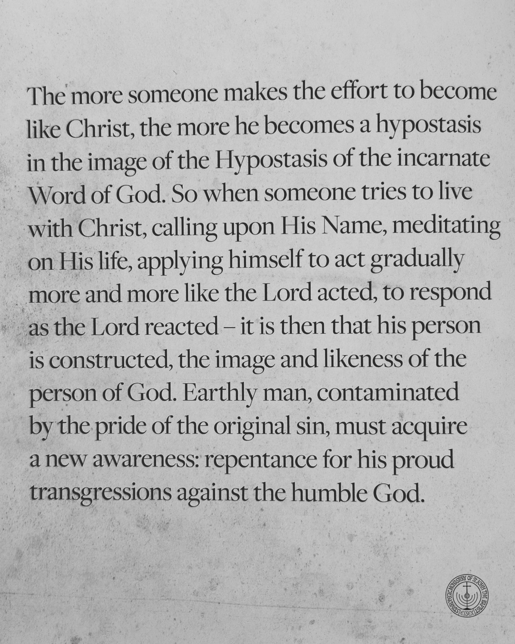 The more someone makes the effort to become like Christ, the more he becomes a hypostasis in the image of the Hypostasis of the incarnate Word of God. So when someone tries to live with Christ, calling upon His Name, meditating on His life, applying himself to act gradually more and more like the Lord acted, to respond as the Lord reacted — it is then that his person is constructed, the image and likeness of the person of God. Earthly man, contaminated by the pride of the original sin, must acquire a new awareness: repentance for his proud transgressions against the humble God.